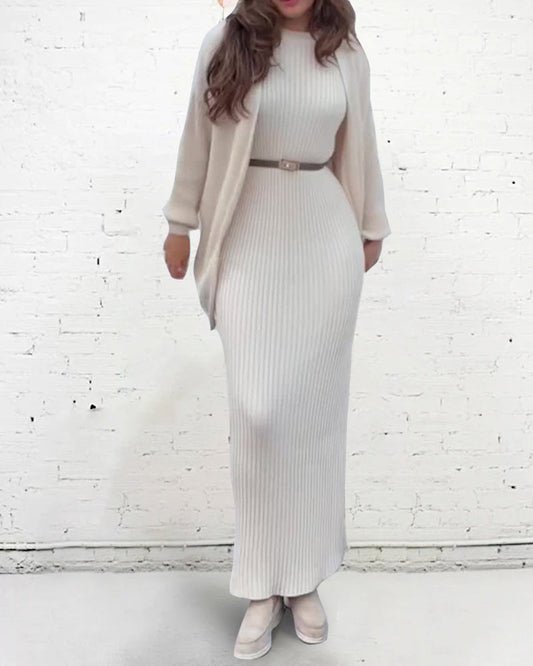 Lazy Style Knitted Sweater Long Dress & Cardigan Two-piece Sets