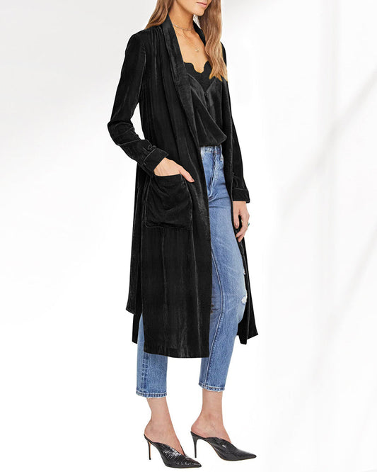Long Velvet Cardigan Jacket Casual Open Front Velour Lapel Cardigan Maxi Blazer
